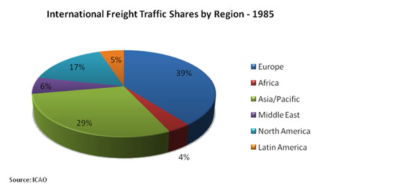 This section presents International Freight Traffic Shares for various regions of the world including Africa as a total of the overall total market share. The data is presented for the years 1985 and 2005.