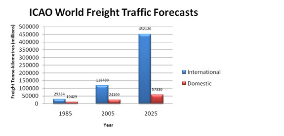 World wide international freight traffic has being growing exponentially in the 20 year period between 1985-2005 and it is expected to follow this trend till the year 2025. World wide domestic traffic on the other hand has been growing steadily in the same period and it is not expected to differ much in the year 2025.