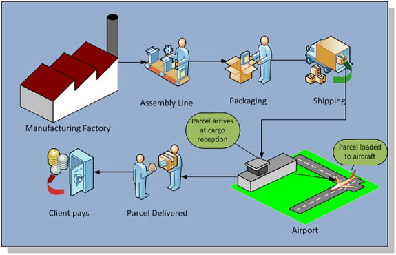 In a typical business environment, a buyer will place an order for an item from the manufacturer/supplier which is delivered by road if the buyer is nearer but high value and perishable items are generally shipped by air for speed and safety. The parcel is packaged and handed to a courier company which takes the item to the cargo terminal at the airport. The parcel is air shipped and delivered to the client on the other side which results in a payment as depicted in Figure 34.