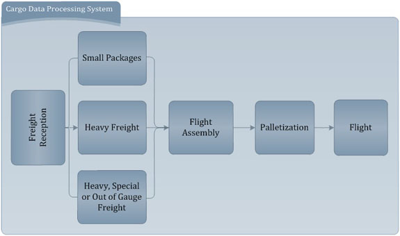 At a cargo terminal, parcels arrives at the reception mainly through freight forwarding companies or brought by individual owners and then documentation is created, since cargo cannot move without documentation. Due to the rapid movement of large volumes of cargo, electronic data processing is essential to control flow of cargo through the terminals with a high level of accuracy and reliability.