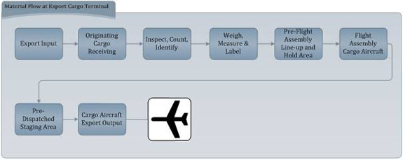 Figure 36 illustrates how export cargo flows through the airport terminal. Incoming cargo for export passes through the reception area, is moved through the documentation area (where it undergoes count, checks, weighing, measuring, and labelling), and either is passed directly into a pre-flight assembly line-up or is placed in a short-term storage area, from which it is eventually transferred into pre-flight assembly.