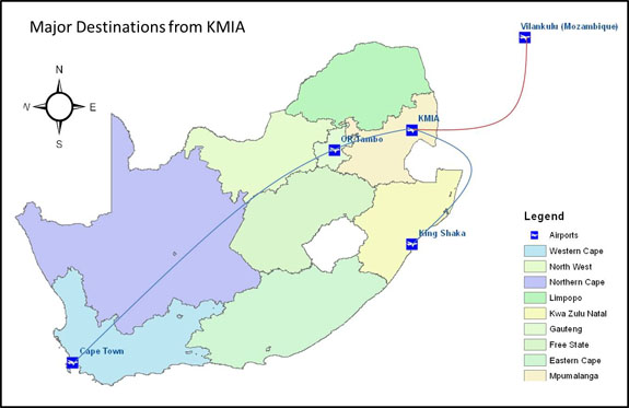 Various domestic and regional destinations are served from KMIA as shown in Figure 7, international air freight destinations are served via the various International airport. Regional flights to Vilankulu in Mozambique are also available.