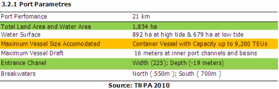 The ports shoreline is approximately 21 km. With the new widened (225 meters) and deepened entrance channel (-19 meters at approach, -18 meters at entrance and -16 meters at inner port channels and basins); the port can handle container vessels with capacity of up to 9,200 TEUs . It is clear that port capacity to meet future growth is catered for in its future development plans. (see Map 3a: Port Future Layout 2030).