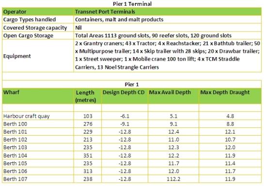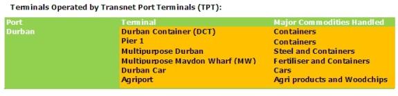 Transnet Port Terminals (TPT) a subsidiary of Transnet; is the largest terminal operator while there are privately operated terminals. The main terminals are the Durban Container Terminal (DCT), Pier 1 and Pier 2, T jetty passenger terminal, Durban Export Terminal for fresh produce, Durban Car Terminal, Maydon Wharf (including sugar and forest products terminals), and Island View Storage for liquid bulk.