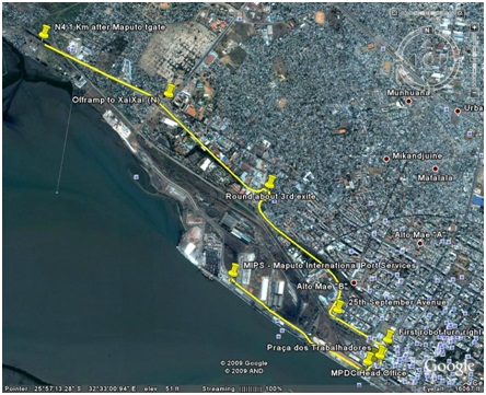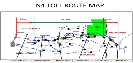 At the new entrance, the Port is now linked by a 1.3 k road which provides access to South Africa’s road network, namely, N4.this translates to about 550 km from Maputo to Gauteng. The N4 toll road7 from east Tshwane (Pretoria) is 503 km. Through this road network additional external access extends to Swaziland, Limpopo and Zimbabwe.