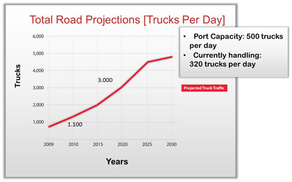 In the future (2015 - 2030) to ensure better logistics movement, capacity of 500 trucks per day will be planned vs. current handling of 320 trucks per day.
