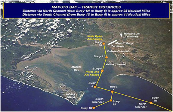 Port Maputo has two modern Z-Peller tugs each of 27 tonne bollard pull. Depending on weather conditions, pilots embark by fast semi-rigid cutter or harbour tug. Mariners can use either of the two channels for reaching the Pilot Station at Buoy 6; the North or South Channel. The South Channel saves about 11 miles for vessels arriving from South African ports, but this channel is subject to strong tidal sets and Masters are advised to check with the port authority before use. Channels and shoals are marked with buoys and beacons. Pilotage through the Xefina and Polana channels into the berths is compulsory from Buoy 6.