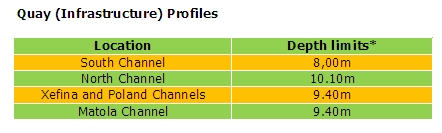 Port Maputo Cargo Terminals operates on a 24 hours a day covering an area of seven hectares. Berth profile is 300 meters with depth of 11 meters. The container terminals handle containerized cargoes of fish products, rice, sugar, fruit, construction materials, and vehicles as well as a variety of other goods. The terminals have capacity to handle 100 thousand TEUs per year, with 68 reefer plug points.
