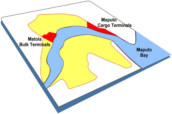 Port Maputo lies on the sheltered estuary of Rio Espirito Santo in southern Moçambique at Longitude 32° 34' E and Latitude 25° 58' S6. The port is currently operating under MPDC management, operating two key terminals (Maputo and Matola Bulk). The approach channels to the port have been dredged to a designed depth of -9.4. Security measures have been re-introduced ISPS codes have been implemented. Inland rail and road traffic has improved and tugs and equipment have been purchased.
