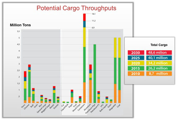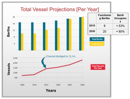 Based on the port master plan conducted in 2008, the port development program takes into account an optimistic growth curve to the functioning and demand for port infrastructure over the next 30 years. The timeframe is 2010 to 2030 focusing on inland (rail and road) infrastructure, waterside berths, dredging and equipment) infrastructure.