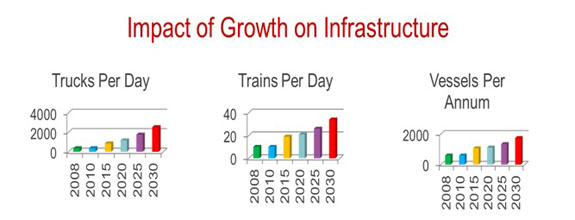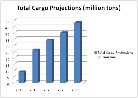 This section presents the projected cargo volume throughputs within this time frame; likely impact this growth will have on infrastructure and finally how this anticipated growth will be achieved (i.e. Capex etc.).