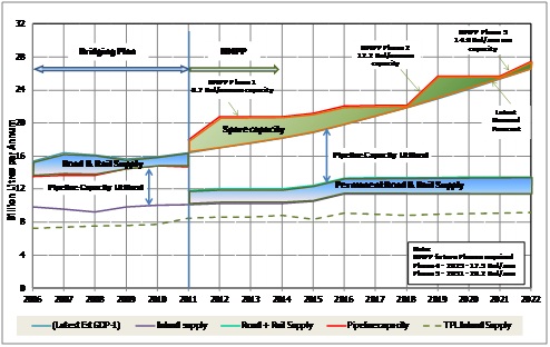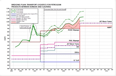Currently the demand in the inland region exceeds the supply of the two inland refineries and this amongst other commercial and contractual arrangements has necessitated the transport of liquid fuel to the inland from the coast; road, rail and pipeline are utilised to fulfill this need. The inherent safety, cost-effectiveness, reliability, ability to convey large volumes and environmental friendliness of the pipeline transport mode makes it the preferred mode of delivery. Current inland demand exceeds the available pipeline capacity and volumes transported by other modes (primarily road) have increased accordingly, but considerations of road safety, cost to the national economy and accelerated wear and tear of the road infrastructure make this situation unsustainable in the long-term. Additional pipeline capacity will be commissioned in third-quarter 2010, in the form of the New Multi-Products Pipeline (NMPP), but continuity of supply has had to be alternatively addressed in the interim. Transnet Pipelines has identified a number of interim initiatives intended to improve delivery of liquid fuels to the Gauteng area in advance of the commissioning during third-quarter 2010 of the first phase of a new multi-product pipeline. Collectively known as the Bridging Plan, the concept of which is to create marginal additional capacity just ahead of growing demand, these initiatives are described in greater detail below.