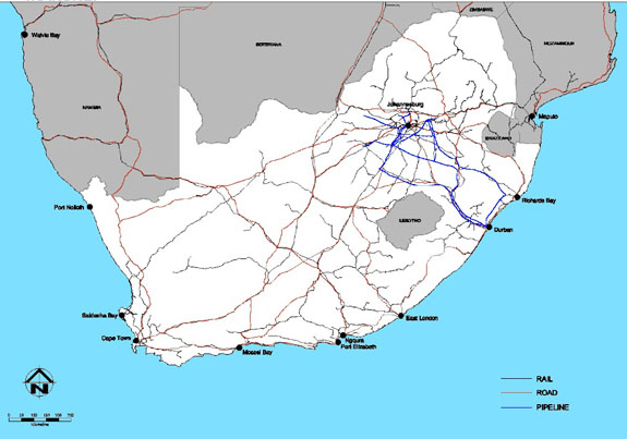 The network covers over 3,000 kilometers and is concentrated between Durban and Gauteng and traverses over five provinces. First established in 1965, due to identified capacity constraints on railways (Durban Mozambique) for Gauteng hinterland consumption; Transnet Pipelines today moves between 16 17 billion liters of refined products and 18 million GigaJoules (GJ) of rich methane gas annually. In terms of future growth, a New Multi-purpose Pipeline (NMPP) is under construction with completion date of 2011 earmarked to secure fuel supply for inland market consumption.