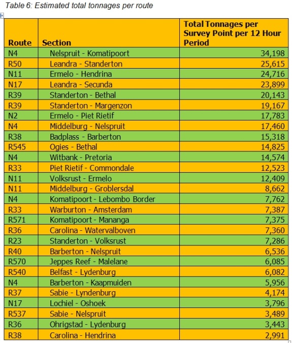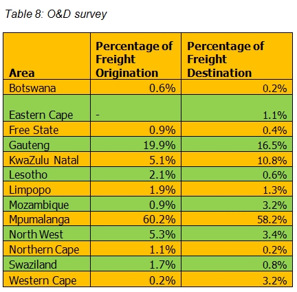 From table 8, it can be observed that about 60% of freight movement within the Mpumalanga Province originates from the Mpumalanga Province, and about 20% originates from the Gauteng Province. About 60% of the total freight is destined within the province, whilst 16% and 11% are destined for Gauteng and KwaZulu Natal respectively.