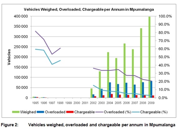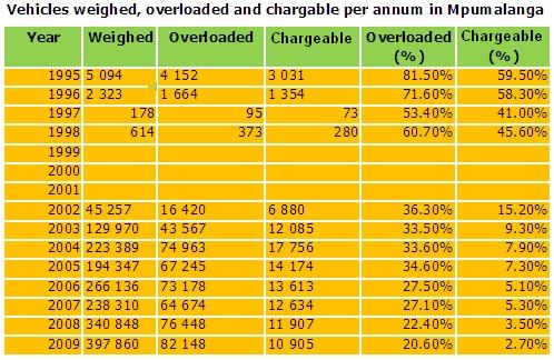 Table 1:Vehicles weighed, overloaded and chargeable per annum in Mpumalanga