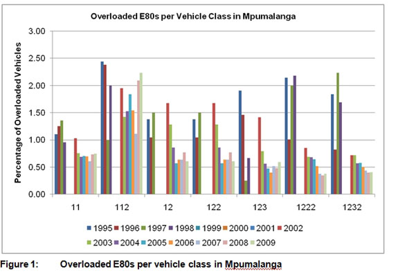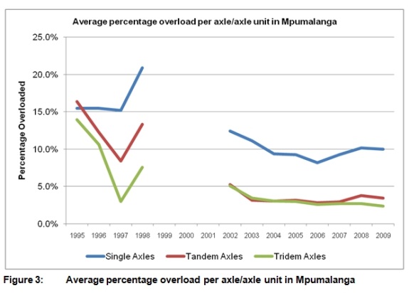 Table 2 and Figure 3 shows the trend in the average percentage overloads on single axles, tandem axle units and tridem axle units in Mpumalanga for the period 1995 to 2009.