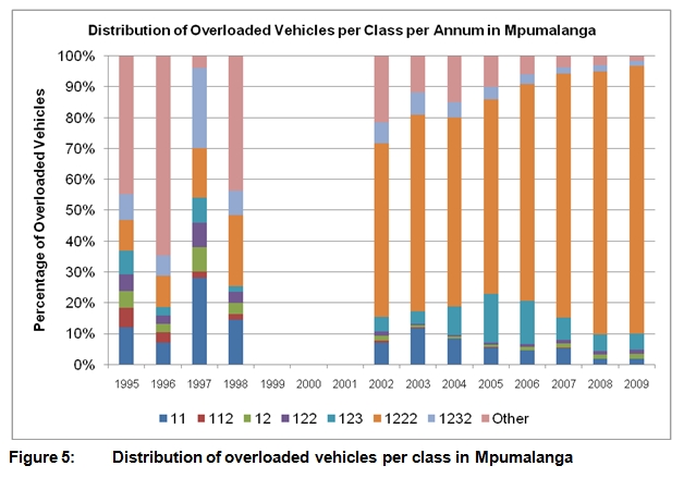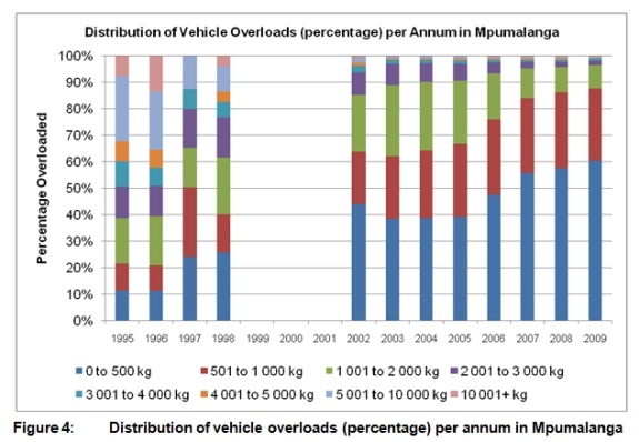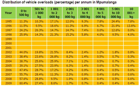 In Table 3 and Figure 4, the distribution of vehicle overloads in Mpumalanga is illustrated by showing the percentage of overloaded vehicles falling in each overload band per year for the period 1995 to 2009.