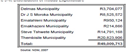 Efficiency in the provision, maintenance and operation of the primary economic road infrastructure network will be facilitated by a professionally managed Roads Agency (SANRAL) with a Board of Control consisting mainly of users from the private sector. The primary road network should preferably be financed through dedicated levy on fuel and toll charges. Further innovative ways of securing finance for the development of road infrastructure will be explored, such as Build-Operate-Transfer (BOT) or Fund-Rehabilitate-Operate-Maintain (FROM). Other rural and inter-city and urban infrastructure will be the responsibility of provincial and local authorities and be funded from a variety of tax sources (NDOT, 2007: 146). The Nkangala District Municipality annually spends approximately R49 Million on Roads and Stormwater infrastructure, this amount is divided between the different local municipalities within Nkangala as set out in Table 1 below.
