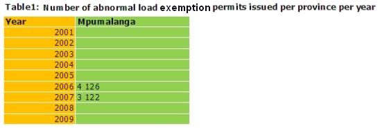 The number of abnormal load exemption permits issued per year in Mpumalanga province for the period 2001 to 2009 is presented in Table 1. These numbers include both mass and dimension permits.