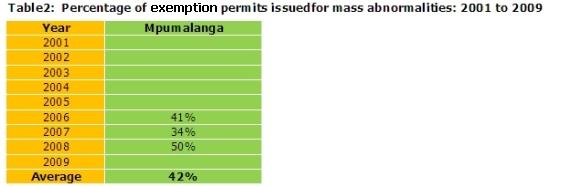 Table 2 presents the mass permits issued per year in Mpumalanga Province for the period 2001 to 2009 are presented as a percentage of all exemption permits issued per year.