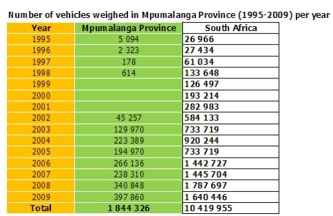 Table 1:Number of vehicles weighed in Mpumalanga Province (1995 -2009) per year