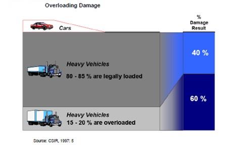 As indicated in Figure 1 it is estimated that about 60% of the damage to roads in South Africa is caused by overloaded heavy vehicles, representing a massive R700 to R800 million per annum. The result has been a steady deterioration of the road network (provincial roads in particular) in South Africa during the past 10 to 15 years. The premature destruction of the life-blood of the economy inevitably compromises road safety, which adds to the already high fatality rate. In addition, overloading results in unfair competition between road transport operators and between road and other modes of transport (MDORT, 2005: 1-1).